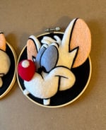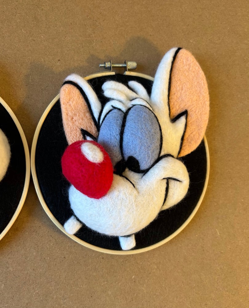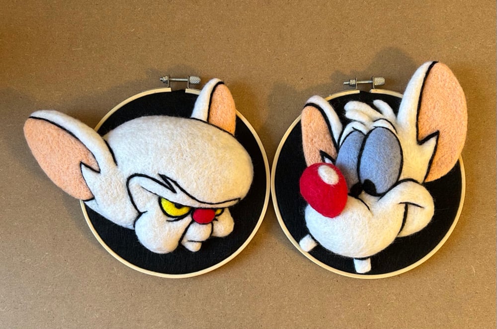 Pinky and the Brain are 8” x 7” and are both mounted on embroidery loops for easy hanging. They are one of a kind needlefelt sculptures made with ethically sourced wool that has been colored with eco friendly dyes.